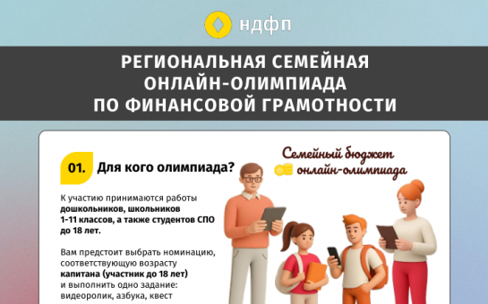Сообщаем Вам о проведении очередной ежегодной региональной семейной онлайн-олимпиады по финансовой грамотности «Финансовая грамотность в семейном бюджете» в Новосибирской области в 2025 году, организатором которой выступает региональный центр финансовой грамотности – автономная некоммерческая организация «Новосибирский Дом финансового просвещения» при информационной поддержке министерства финансов и налоговой политики Новосибирской области.